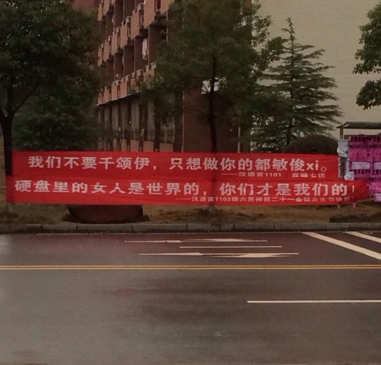 當然雷人的標語也不少,比如“今天你不陪她過女生節(jié),明天別人就帶她過婦女節(jié)!”、“硬盤里的女人是世界的,你們是我們的!”等雖然也反映了高校生活某些方面,但思想境界并不高。