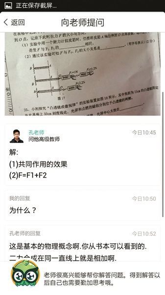 一款較為火爆的解題神器——“問他作業”,進入應用主頁后,頁面上顯示“我要提問”的指示圖標,點擊進入后,有兩個“提問方式”供選擇,一為“向學霸提問”,二為“向老師提問”,記者點選了“向老師提問”,上面注明需“付費”,記者注冊并充值后進入正式提問頁面,需填寫“選擇年級和學科”后,“上傳圖片或輸入問題”。記者隨機拍了一道初二物理“力學”試題上傳,5分鐘后一位標注為“問他高級教師”的孔老師給了答案,答案中沒有任何解析說明。記者隨后點了回復,提問“為什么?”孔老師2分鐘后回復,“這是基本的物理概念啊,你從書本可以看到的,二力合成在同一直線上就是相加啊。”整個解題結束后,系統提醒“是否采納答案”,點擊“采納”后,扣除了2個問豆,即2塊錢。