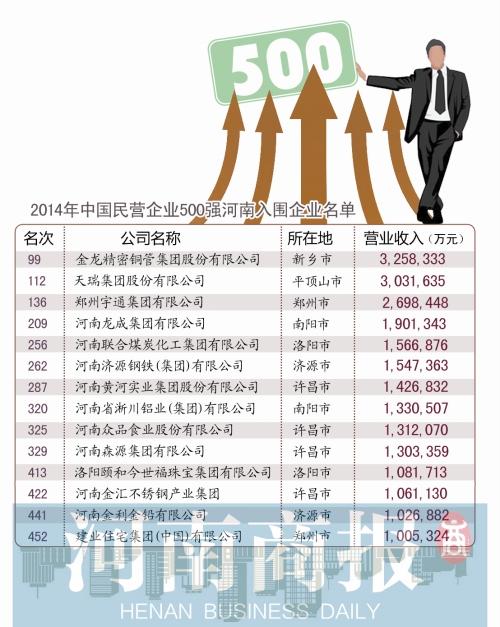 同時,據(jù)河南商報記者統(tǒng)計,共有14家豫企入圍2014年中國民營企業(yè)500強,其中,金龍精密銅管集團股份有限公司以325.83億元的營業(yè)收入位列河南榜單第一,天瑞集團、宇通客車分列二、三位。