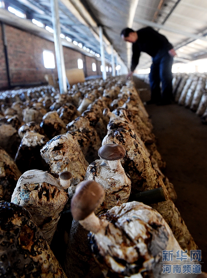 2月10日,農戶在光伏發電農業大棚內查看食用菌的長勢。