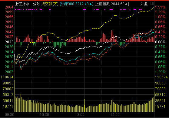 截至收盤,滬指報2044.50點,上漲11.42點點,漲幅0.56%,成交678.30億元;深成指報7616.57點,上漲43.94點,漲幅0.58%,成交1139.54億元;創業板指報1532.69點,上漲36.71點,漲幅2.45%,成交341.63億元。