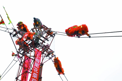 十幾米的高臺(tái),四周用繩子牽引,獅子就利用繩子爬上高臺(tái)。隨著上面“板叉”“頭扛尾”“倒立”等驚險(xiǎn)表演,臺(tái)下不時(shí)發(fā)出驚呼聲,孩子們都看得目不轉(zhuǎn)睛,許多人拿著手機(jī)拍照,附近居民樓上許多人從窗戶里探身往外看。