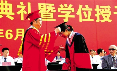 鄭州大學(xué)校長劉炯天在畢業(yè)典禮上為學(xué)子撥穗