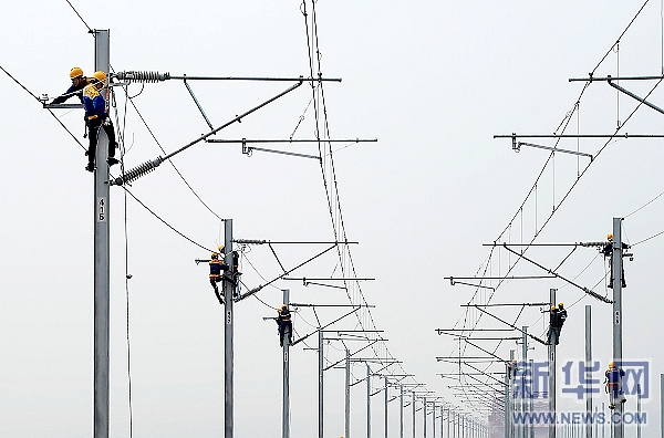 5月8日,工人在鄭焦城際鐵路黃河大橋引橋上調試接觸網腕臂。