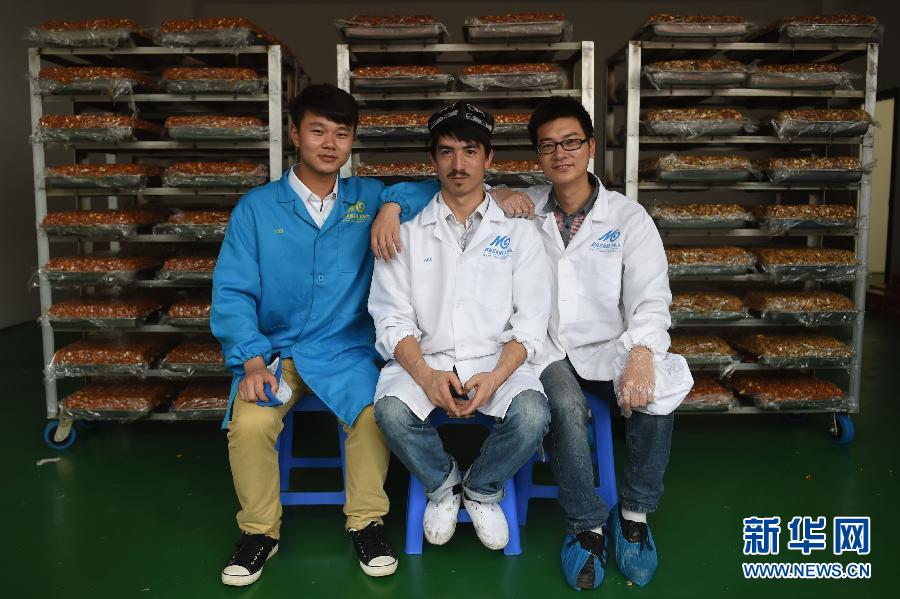 圖為阿迪力·買買提吐熱、蔣金亞(右)和蔣春楊在妙盛國際工業園的切糕庫房里合影(6月1日攝)。