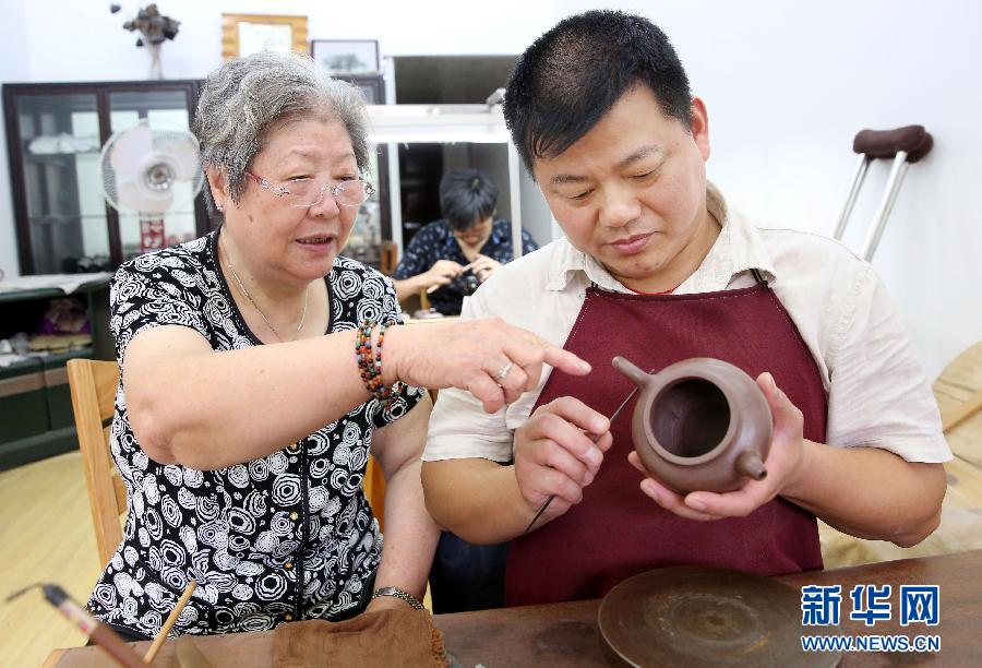 6月23日,在江蘇宜興紫砂陶藝名家曹婉芬的工作室,曹婉芬(左)在指導身有殘疾的“徒弟”唐國忠制作紫砂壺。
