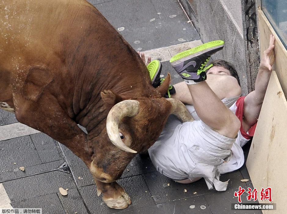 當地時間2014年7月14日,西班牙潘普洛納奔牛節持續。據外媒報道稱,截至14日共有兩名參賽選手在奔跑中被牛角頂傷。