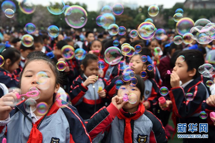 3月2日,廣西南寧市濱湖路小學的孩子們吹泡泡慶祝開學。當日,廣西南寧市中小學正式開學。南寧市濱湖路小學在開學典禮舉辦各種趣味活動,讓學生們在歡樂中迎來開學。 新華社記者 周華 攝