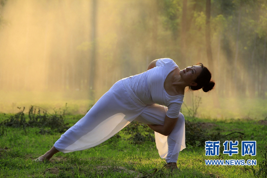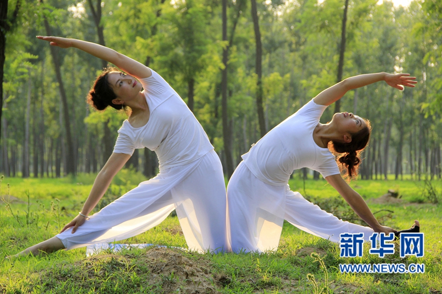 6月19日,瑜伽愛好者在內黃縣萬畝槐林內練習瑜伽。夏至時節,河南省內黃縣瑜伽愛好者走進槐林深處,在樹蔭下舒展身心,靜享清涼。