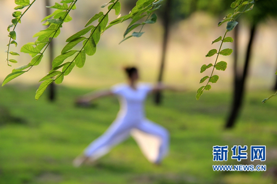 夏至時節,河南省內黃縣瑜伽愛好者走進槐林深處,在樹蔭下舒展身心,靜享清涼。新華網發(劉肖坤