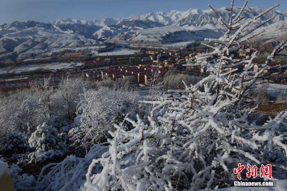 4月16日,地處祁連山腳下的甘肅肅南裕固族自治縣現唯美霧凇景觀。晶瑩的霜花、冰凝附著在樹枝上,遠望銀裝素裹,潔白一片,宛如仙境。由于連續降雪,當地草原積雪最厚達10厘米,并出現大霧,驟降的氣溫使得消融的河水重新結冰,蒼茫大地一片銀裝素裹。武雪峰 攝 -