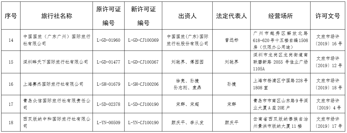 央廣網北京5月28日消息(記者梁晨) 5月27日,文化和旅游部發布《關于許可旅行社經營出境游業務的公告》。公告顯示,按照《旅行社條例》和《中國公民出國旅游管理辦法》,許可以下18家旅行社經營出境游業務: