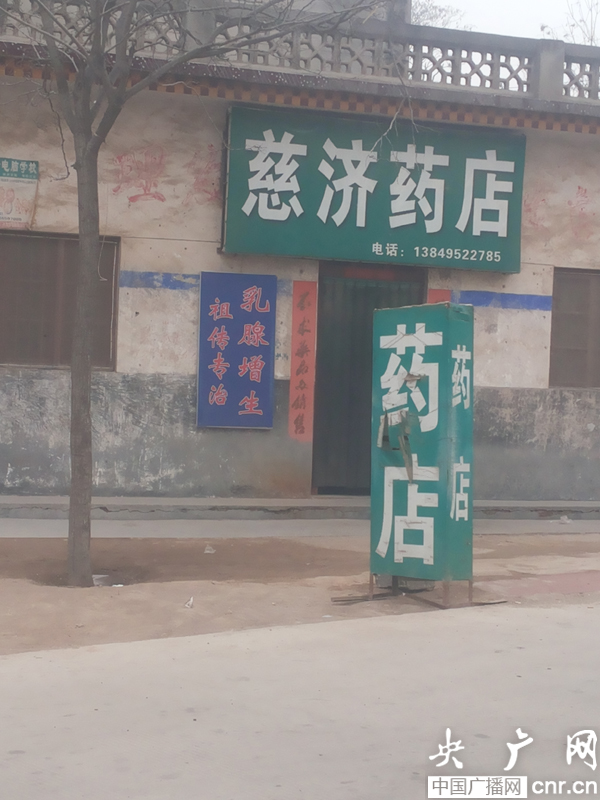 元月7日,在溫縣岳村鄉方頭村,有一家名為“慈濟藥店”的藥房,門口還掛有“專治乳腺增生”的廣告招牌,店主是一位五十多歲的男性。記者稱牙疼需要診治,該男子表示:“你找我就是找對人了,我專治牙疼”。接著,他便頭也不抬,連病情也不問,隨即包好了六小包藥遞給記者:“給,20分鐘保準止住疼,一共八塊錢”。
