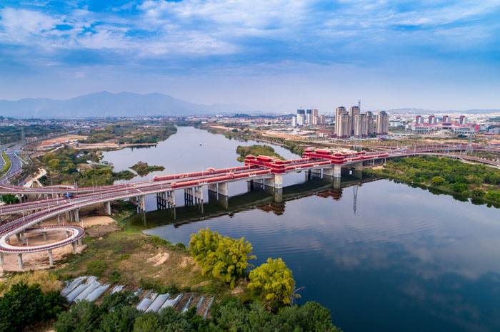 凌空俯瞰金峰大橋,紅色的廊亭、樓閣十分醒目的橫跨在九龍江西溪上。金峰大橋設(shè)計為景觀性大橋,主橋橋型采用“廊橋薌韻”方案,橋梁兩側(cè)人行道設(shè)置有長廊和古亭,橫向設(shè)置兩座人行天橋,紅磚瓦、燕尾屋融入了閩南特色建筑元素。金峰大橋是漳州九龍江上第一座具有“閩南薌韻”廊橋和古亭標(biāo)志性的大橋,成為漳州一張最靚麗的名片。
