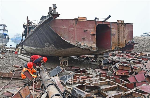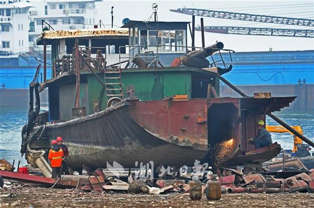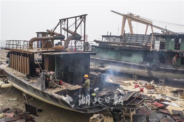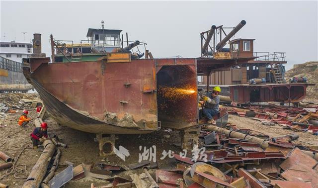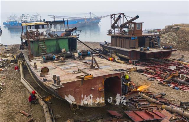 2月24日,長江湖北省枝江市七星臺江段岸邊,當(dāng)?shù)厮䦂?zhí)法部門開始強行對4艘吸砂船進(jìn)行強制拆解。