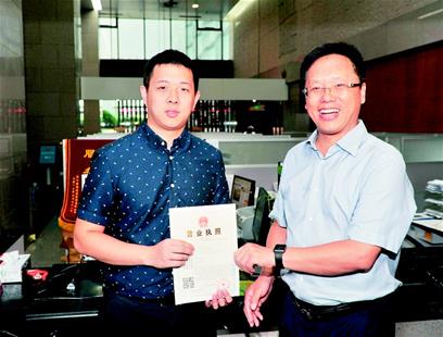 圖為:企業負責人(左)從武漢市工商局局長劉濤手中領到首張“28證合一”工商執照