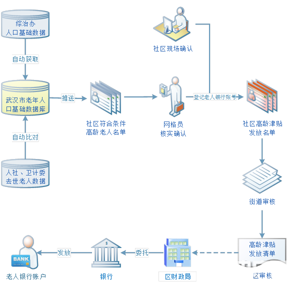 高齡津貼發(fā)放改革方面,從2018年1月1日起,武漢全市將依托養(yǎng)老服務(wù)信息平臺按季度發(fā)放高齡津貼。具體發(fā)放流程分為:第一步信息核查,武漢市養(yǎng)老服務(wù)信息平臺每季度末月將數(shù)據(jù)庫中的高齡老年人信息分配到社區(qū)(村),由網(wǎng)格員進(jìn)行核查;第二步審核確認(rèn),街道(鄉(xiāng)鎮(zhèn))核實確認(rèn)高齡津貼發(fā)放清單后,于每季度末月的20日前提交給區(qū)民政局(老齡辦)審核;最后是資金發(fā)放,區(qū)財政局根據(jù)區(qū)民政局(老齡辦)審核確認(rèn)的高齡津貼發(fā)放清單,將高齡津貼資金通過國庫集中支付到老人銀行賬戶上。