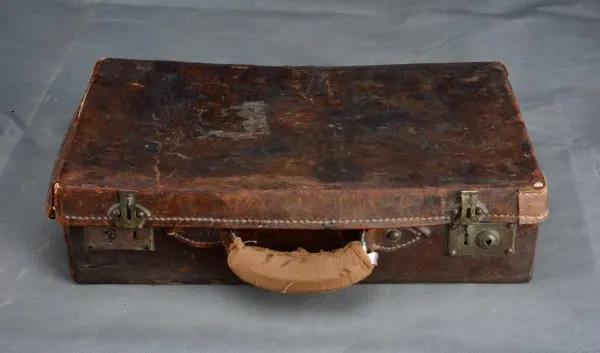 皮箱為棕褐色,長45厘米、寬26厘米、高11.5厘米,呈長方形,牛皮質地。經過近百年的風雨洗禮,它已斑駁破舊。