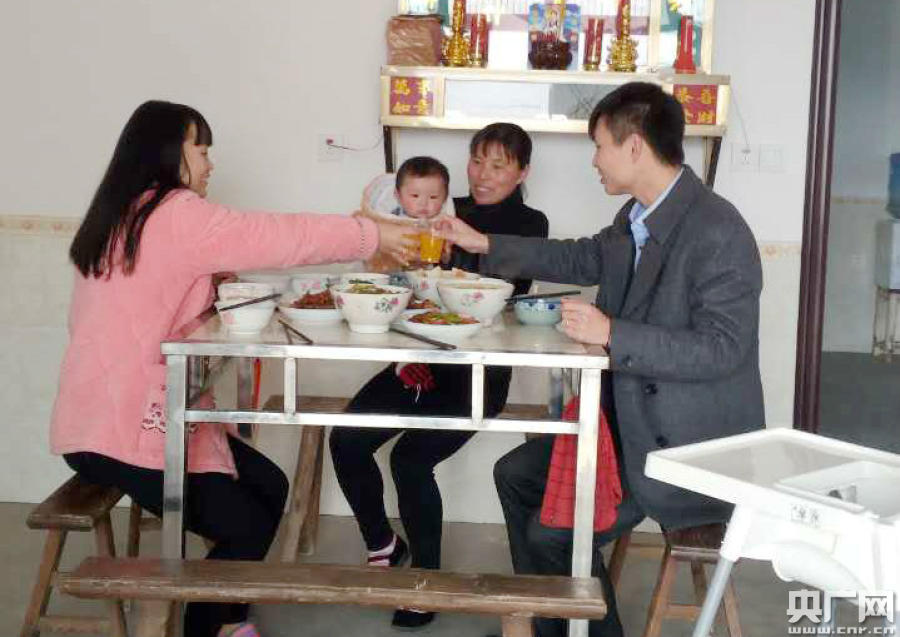 小譚家住在衡陽(yáng)市郊,距離單位接近十五公里。因?yàn)榭紤]到兒子晚上要值乘,他家的年夜飯?zhí)崆霸谙挛?點(diǎn)開(kāi)始。飯桌上,譚媽媽準(zhǔn)備了滿滿一桌子菜。譚住寶以茶代酒敬了母親,扒了幾口飯,親了下尚在襁褓中的女兒后就撤,因?yàn)橥砩纤要開(kāi)工。 譚住寶家提前的年夜飯 -