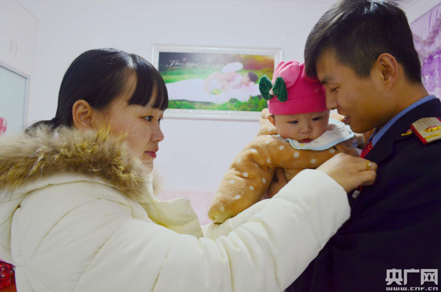 出乘前, 譚住寶再次抱了一下女兒。妻子白媛則在一旁為他整理領(lǐng)帶。這對(duì)小夫妻結(jié)婚一年,在一起的時(shí)間卻是少的可憐,剛結(jié)婚那會(huì)兒,白媛還有點(diǎn)抱怨,后來(lái)了解到忙是火車司機(jī)的職業(yè)特點(diǎn),她也就慢慢理解,現(xiàn)在是非常支持老公的工作。但是,今天是除夕,老公卻要出乘,她還是有點(diǎn)不舍。 出乘前,妻子為譚住寶整理領(lǐng)帶 -