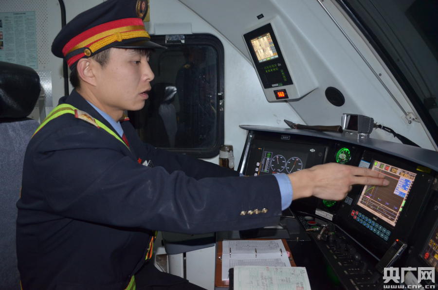 火車司機(jī)工作中除了需要精神高度集中,口、手、腳也不能閑著。一路上,每接近一架地面信號(hào)機(jī),譚住寶便大聲呼喚信號(hào)顯示情況,右手做出手勢(shì)比對(duì)確認(rèn);通過(guò)車站時(shí),用腳踩響鳴笛,一直忙個(gè)不停。這樣簡(jiǎn)單卻又枯燥的動(dòng)作,他一次出乘作業(yè)要重復(fù)超過(guò)300次。 譚住寶在執(zhí)行標(biāo)準(zhǔn)化作業(yè)手勢(shì) -