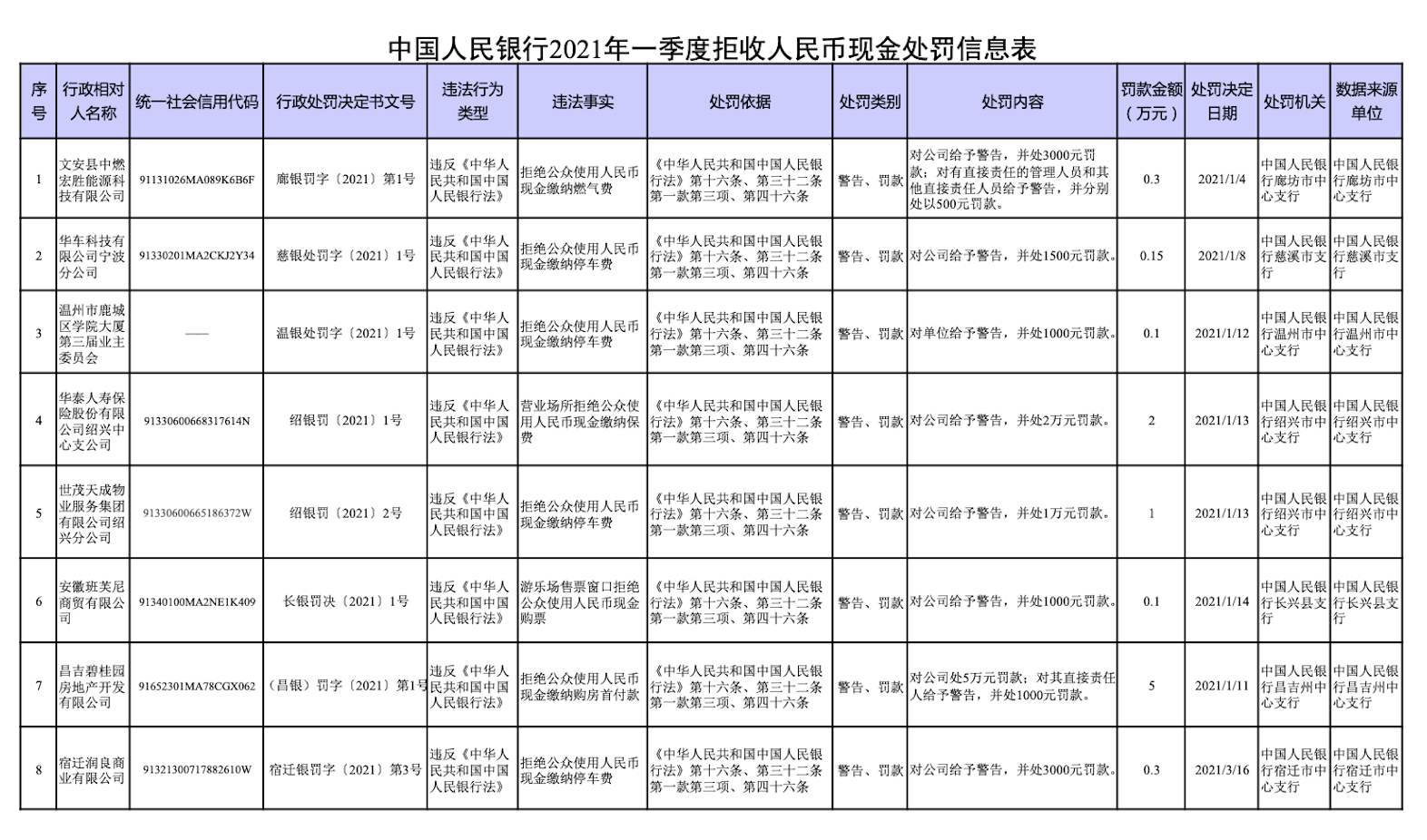 附:中國人民銀行2021年一季度拒收人民幣現金處罰信息表