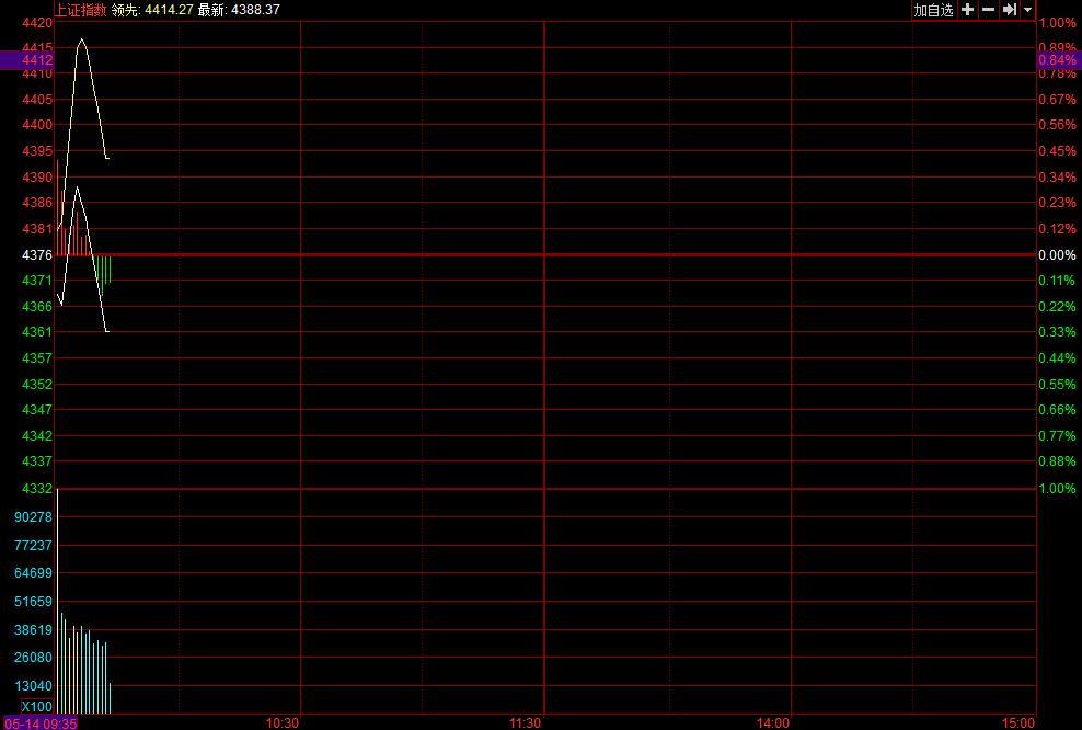 央廣網北京5月14日消息 據經濟之聲《交易實況》報道,今天(14日)開盤,滬指報4372.82點,跌2.94點,跌幅0.07%;深成指報15210.75點,漲37.66點,漲幅0.25%;創業板報3174.45點,跌幅0.55%。
