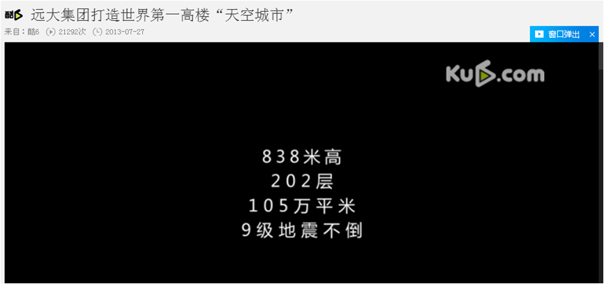 這部宣傳片列舉了一長串驚人數字:“天空城市”將建造838米,地上202層,地下6層,共計208層,超越迪拜哈里發塔(828米)成為世界第一高樓。項目凈占地30畝,建筑面積105萬平方米,9級地震不倒。