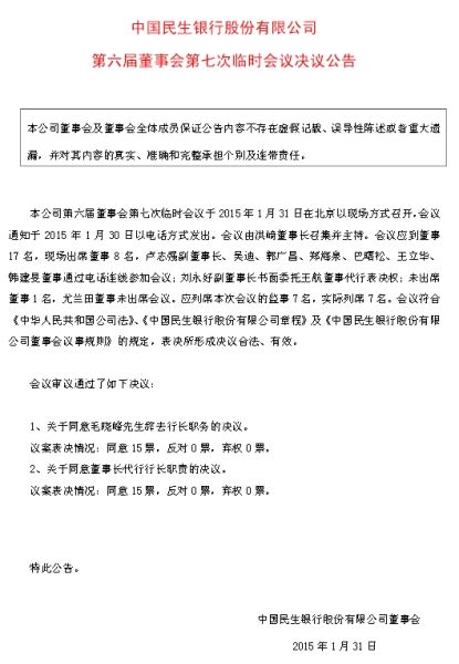 民生銀行31日在上交所發布公告稱,公司董事會收到毛曉峰辭職信,因其個人原因,申請辭去中國民生銀行董事、行長及董事會相關專門委員會職務。行長職責由洪崎董事長代行。