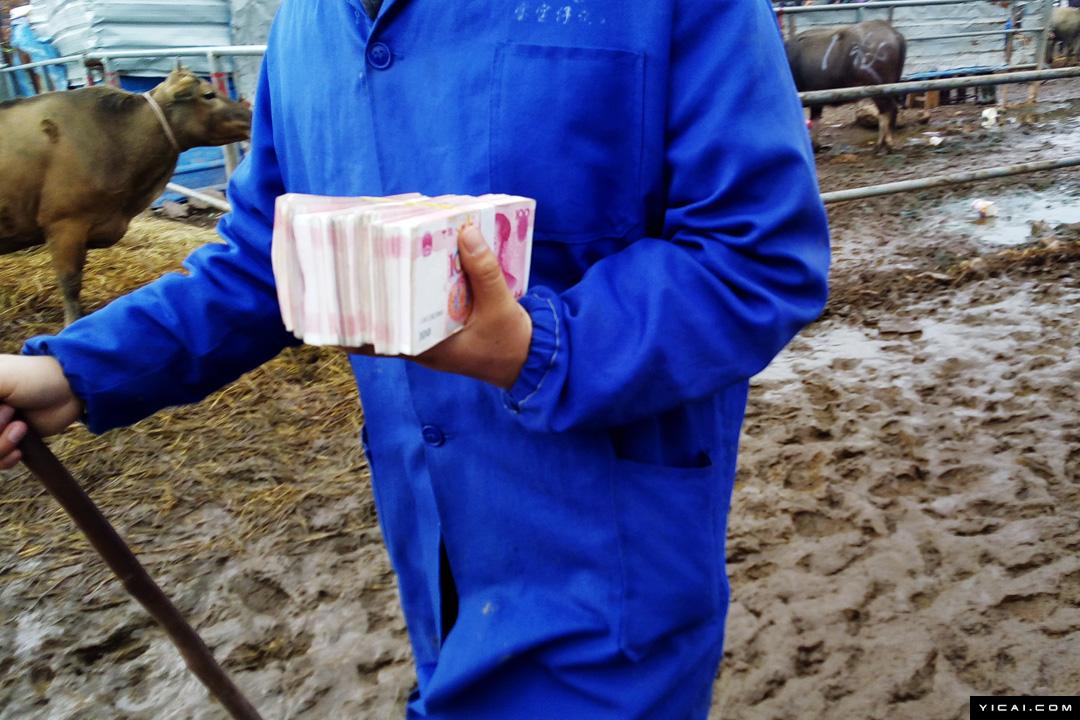 金華牛市有“華東第一牛市”的稱號,長三角地區的牛,多是這里交易。通常一個交易日,幾千頭牛。在牛市交易過程中,活躍著一個特殊的職業群體——牛經紀人,一頭牛多重,值多少錢?買賣雙方不是靠秤,而是靠經紀人來估。圖為一名牛市經紀人手持大額現鈔,牛市交易雙方基本依靠現金。",