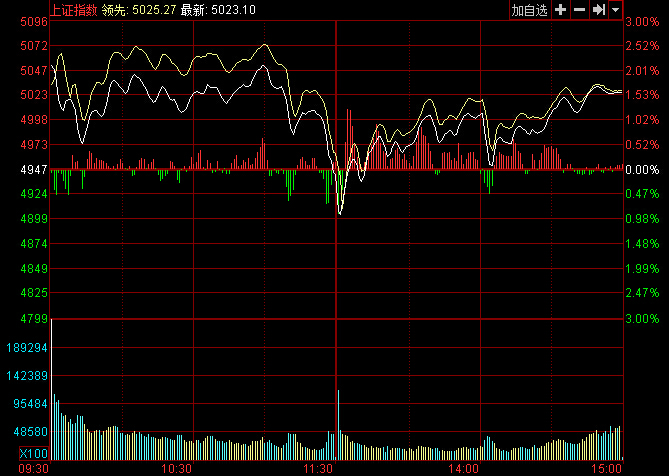 收評(píng):滬指巨震漲1.54%上5000點(diǎn) 成交超兩萬(wàn)億
