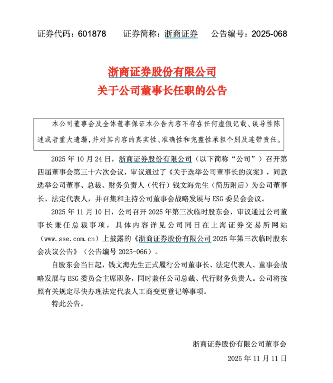 公告顯示,2025年10月24日,浙商證券召開第四屆董事會第三十六次會議,審議通過了《關于選舉公司董事長的議案》,同意選舉公司董事、總裁、財務負責人(代行)錢文海為公司董事長、法定代表人,并召集和主持公司董事會戰略發展與ESG委員會會議。