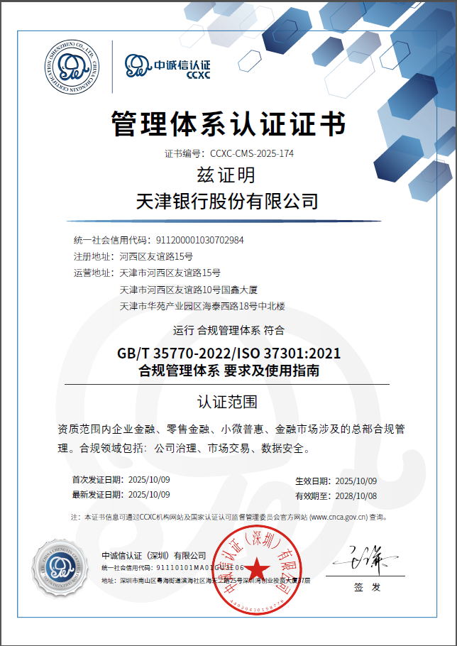 近日,天津銀行通過GB/T 35770-2022 / ISO 37301:2021合規(guī)管理體系認(rèn)證審核,獲得中誠信認(rèn)證頒發(fā)的合規(guī)管理體系國內(nèi)國際雙認(rèn)證證書,成為全國首批獲得該項雙標(biāo)認(rèn)證的城商行之一。
