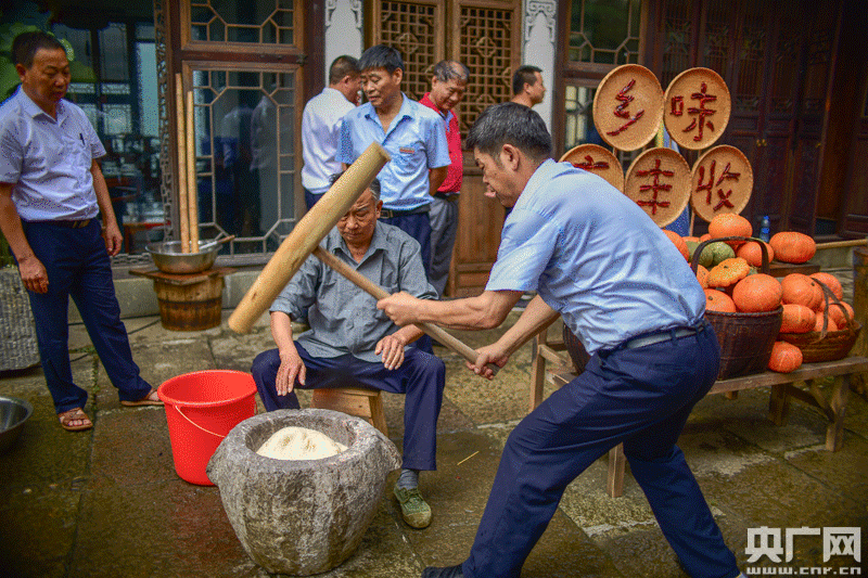 15日,一場徽州婚俗之旅,真實再現了古徽州傳統婚俗。其中的迎親儀仗隊、拜天地、拜高堂、掀蓋頭、撒粿籽等環節,都取材于真實的古徽州婚嫁迎娶風俗。長街宴席,把天街占得滿滿當當,五湖四海的游客歡聚一堂,把酒言歡,感受地道的農家味道。22日,十多個石臼在眾屋廣場一字排開,數百人一起熱火朝天的打麻糍,場面很是壯觀。還有各種花樣民俗,讓你新奇不已,不由得想體驗一番。