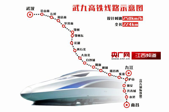 武九高鐵起于湖北武漢,終抵江西九江,設計時速250公里,全長224公里。全線設有武漢站、花山南站、左嶺站、葛店南站、華容南站、鄂州站、鄂州東站、花湖站、黃石北站、大冶北站、白沙鋪站、陽新站、楓林站、瑞昌西站、柴桑站、廬山站和九江站等17個車站。