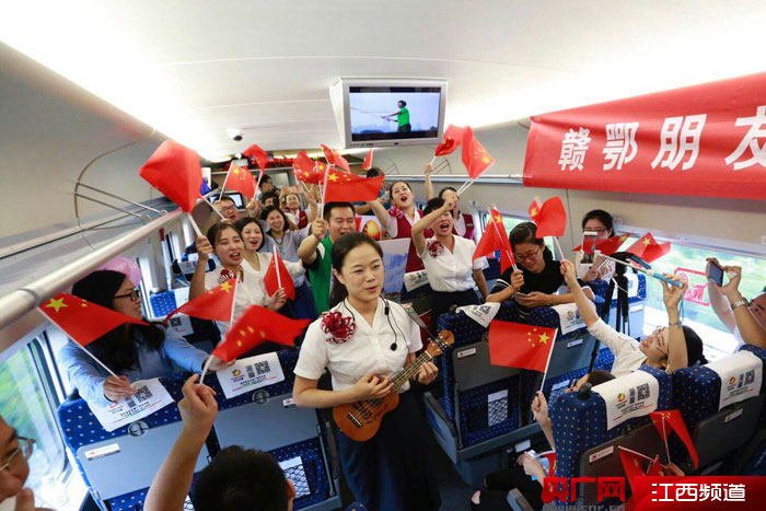 活動現場熱鬧非凡,美麗的乘務員為乘客們展示才藝,應景地表演了舞蹈《櫻花》。乘務員還與乘客們互動,讓乘客們通過吃或者聞,猜出武九高鐵沿線的地方美食。