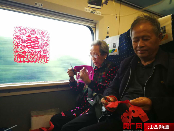 瑞昌剪紙藝術家在武九高鐵上表演剪紙