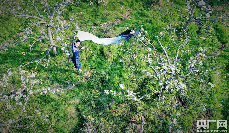 舞蹈愛好者在梨花林里,翩翩起舞(央廣網發 通訊員田俊/攝)