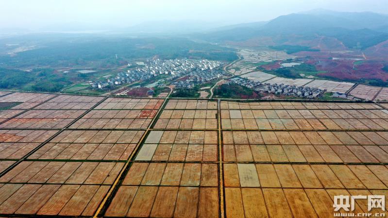 3月30日,江西省吉安市吉水縣水田鄉峽江水利樞紐工程抬田區,翻耕好的農田整齊排列等待插秧,橫平豎直氣勢壯觀