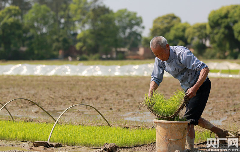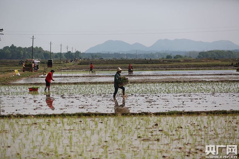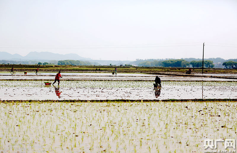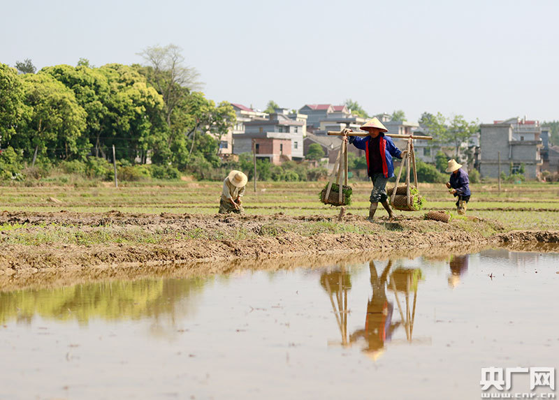 4月9日,江西省吉安市吉水縣丁江鎮塘邊村高標準農田建設區,村民正在起收秧苗