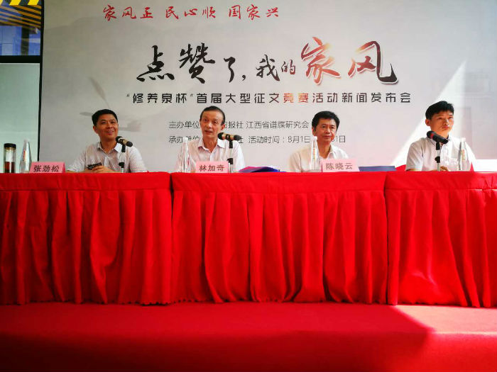 央廣網(wǎng)南昌8月6日消息(胡斐)8月6日上午,由江西日報(bào)社和江西省譜牒研究會聯(lián)合主辦、新法制報(bào)社承辦的修養(yǎng)泉杯首屆“點(diǎn)贊了,我的家風(fēng)”大型征文競賽活動新聞發(fā)布會在經(jīng)開正榮府隆重舉行。主辦單位江西省譜牒研究會林加奇會長、江西日報(bào)社副總編輯陳曉云,活動冠名單位修養(yǎng)泉?jiǎng)⒘疗娇偨?jīng)理出席了本次活動。江西省譜牒研究會副會長兼秘書長張勁松主持。