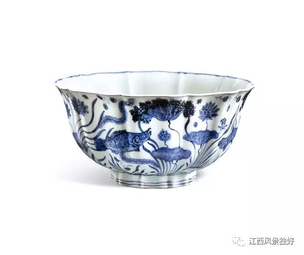 宣德時期的魚藻紋多繪鯖、鲌、鰱、鱖游魚四尾,諧音寓意“清白廉潔”。此碗繪鯖、魴、鱖三種游魚,與蓮花相組合,寓意“清廉”、“廉潔”,代表儒家思想中正直君子的完美形象。蓮花出污泥而不染,也是清白、純凈的象征。又魚與余同音,為富貴有余的象征,與蓮塘組合含“連年有余”之吉祥寓意,體現了中國自古以來特有的吉祥文化。明宣德青花魚藻紋十棱菱口大碗在2017年4月香港蘇富比拍賣會上以2.29億港元拍賣成交。