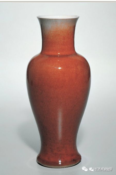 清康熙四十四年至五十一年(1705-1712),江西巡撫郎廷極奉派前往景德鎮御窯廠管理燒造事宜,生產的瓷器中有一種遙仿自宣德的紅釉器,色澤鮮艷,特別引人注目。因是郎廷極監造之下的產物,所以稱為“郎窯紅”。此瓶形制和觀音手持之凈瓶相似,故又有觀音尊之稱。瓶口不規則的脫釉,則是郎窯紅作品的典型風格。觀音尊器形優美勻稱,釉色鮮紅,光彩奪目。此瓶釉質純凈肥潤,玻璃質感極強。口沿及底足處有一圈白色邊緣,俗稱“燈草邊”。瓶的內壁施白釉,白色純正,類雪似銀,與器表的鮮紅色形成強烈的對比,相映成趣,是一件成功的紅釉之作。