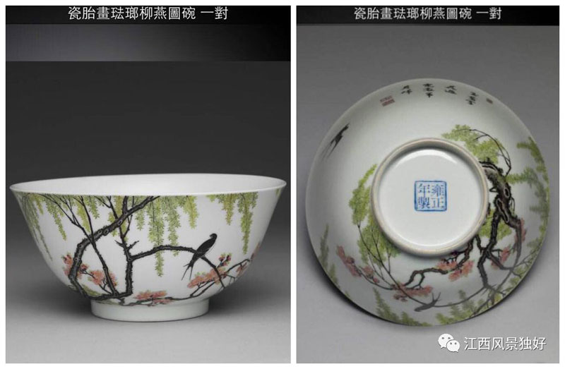 清雍正瓷胎畫琺瑯柳燕圖碗