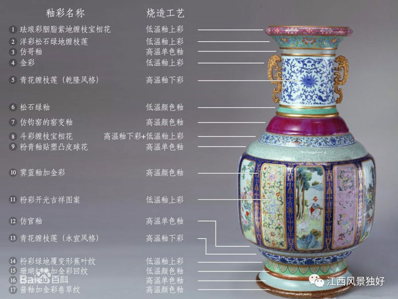清乾隆各種釉彩大瓶,清代乾隆年間燒制,高86.4厘米,口徑27.4厘米,足徑33厘米。器身自上而下裝飾的釉、彩達17層之多,其標志著中國古代制瓷工藝的頂峰,享有“中華瓷母”的美稱。現藏北京故宮博物院。