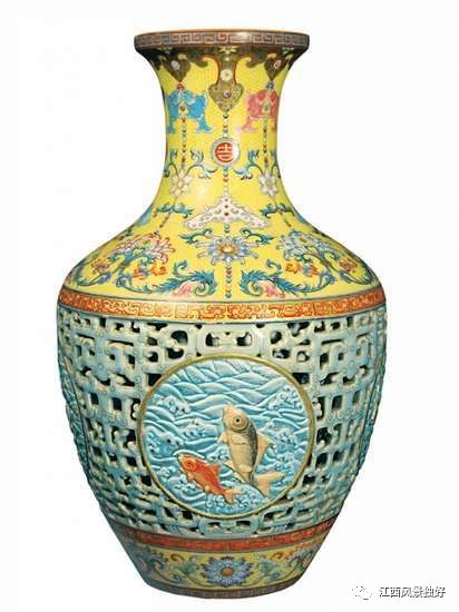 分為內外兩瓶。內外于瓶頸相連,內瓶底部與外瓶內心連接,外瓶瓶身鯉魚圖案栩栩如生,配以鏤空水波紋雕花設計,顯得雍容富貴,瓶頸上紅色“吉”字蘊含吉祥如意,由外部可以看到內瓶繪制的青花圖案。該品內繪青花,外畫洋彩、琺瑯彩、粉彩,運用描金,鏤空、轉心、浮雕、淺刻等多種工藝,極盡奢華、嘆為觀止,屬于清三代瓷器中的巔峰之作。乾隆粉彩鏤空“吉慶有余”轉心瓶在2010年11月11日的倫敦的拍賣中以折合人民幣5.541億元的價格成交。