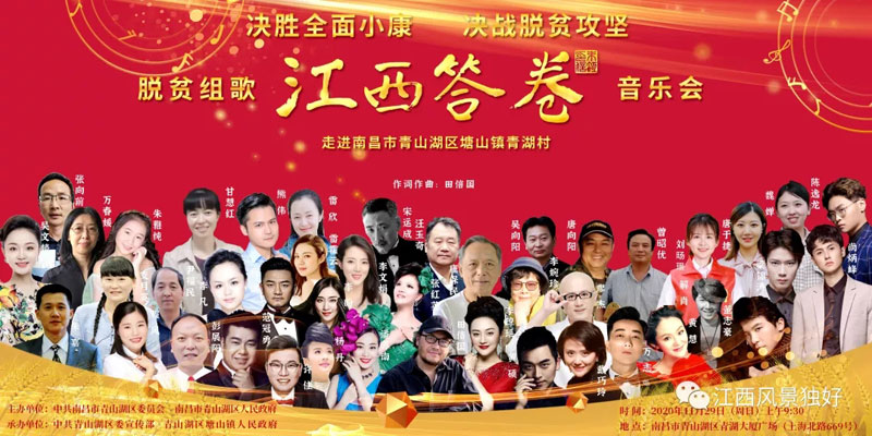 近日,一場以“決勝全面小康、決戰脫貧攻堅”為主題的脫貧組歌《江西答卷》音樂會(田信國作詞作曲)在南昌市青山湖區塘山鎮青湖村廣場首演。支月英、程風、康保民、宋運成、程波、張紅英、李凡、李盼、李瓊瑤、吳文婷、廖杰、戴巧玲等300余名藝術家和文化文藝志愿者為廣大市民帶來了一場藝術盛宴,讓大家忘卻初冬的寒意,感受到了陣陣暖意。