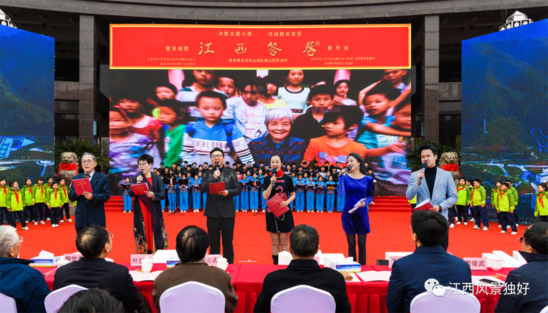 江西是革命老區,曾經為中國革命做出過巨大犧牲和巨大貢獻。江西也是全國脫貧攻堅主戰場之一。全省25個貧困縣都是重點老區縣,大部分處于贛南等原中央蘇區。其中,24個為國定貧困縣,1個為省定貧困縣。2020年4月26日,江西省政府召開新聞發布會,正式宣布于都縣、興國縣、寧都縣、贛縣區、鄱陽縣、修水縣、都昌縣7個貧困縣(區)脫貧退出,這是我省第四批次貧困縣脫貧退出。至此,全省25個貧困縣全部脫貧退出,意味著歷史性解決江西老區群眾絕對貧困問題,這是我省扶貧開發史上具有里程碑意義的重大事件。對此,開場曲《老表的掌聲響起來》生動表達了老區群眾的激動與祝福:“老表的掌聲響起來,映山紅花兒在盛開。脫貧宣言暖民心,決勝小康大步邁!老表的掌聲響起來,千萬顆心兒在期待。鄉村振興奏凱歌,美好生活樂開懷……老表的掌聲響起來!江西好運當頭,老表幸福常在!”