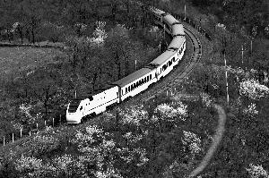 3月28日,一列火車在北京居庸關附近的山花中穿行。新華社發