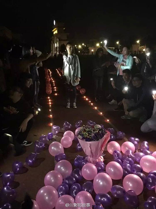 這不是求婚!4月6日晚,四川電影電視學(xué)院操場(chǎng)上@川影2015級(jí)編導(dǎo)六班的同學(xué)們給美女輔導(dǎo)員過(guò)生日,全班男生單膝跪地唱《小幸運(yùn)》。